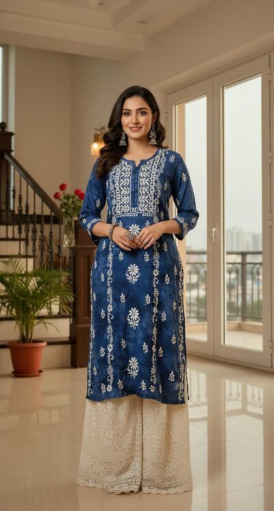 Blue Denim Style Chikankari Mulcotton Kurta