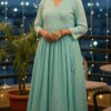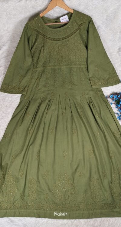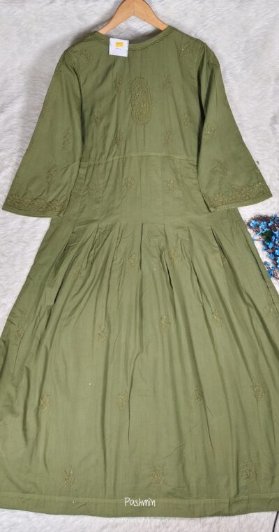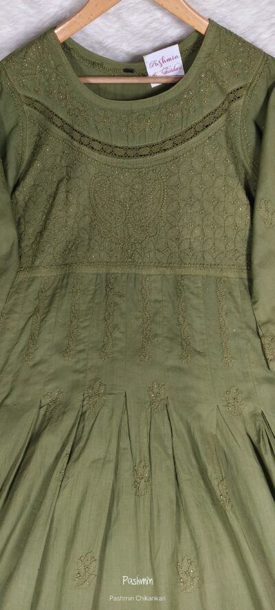 Pastel Green Chikankari Cotton Gown With Mukaish And Lace Work