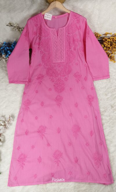 Pink Chikankari Crotia Neck Cotton Kurta