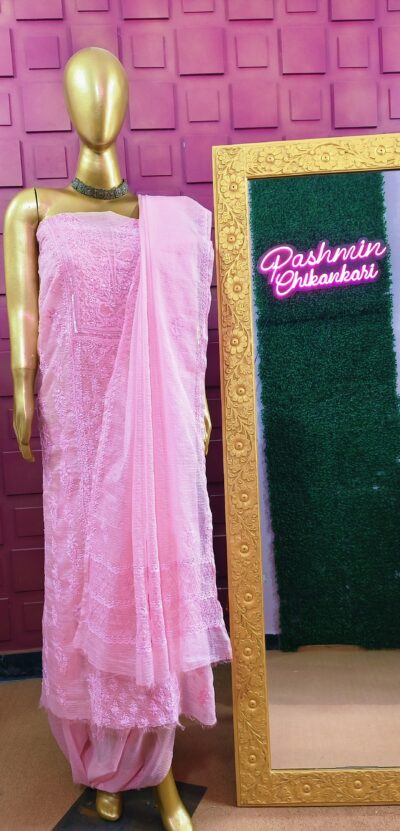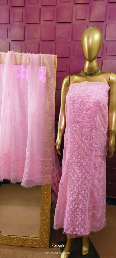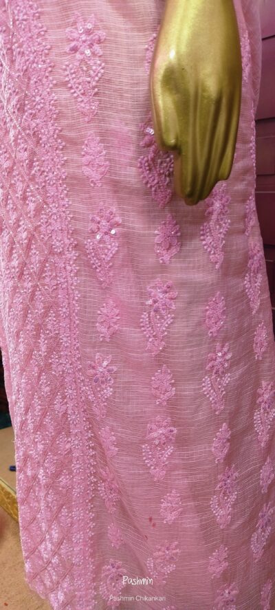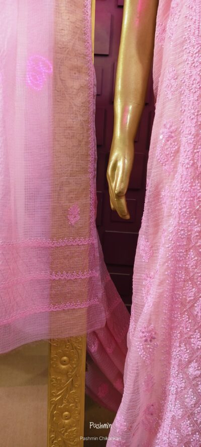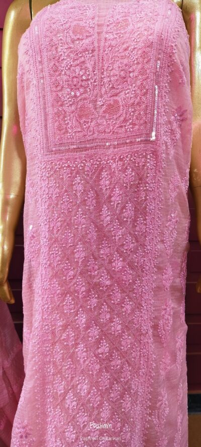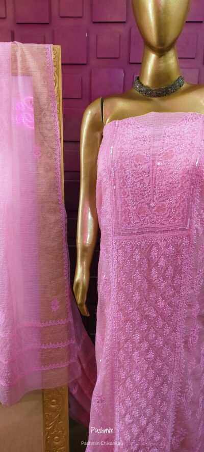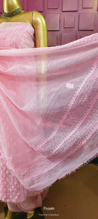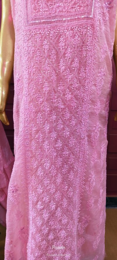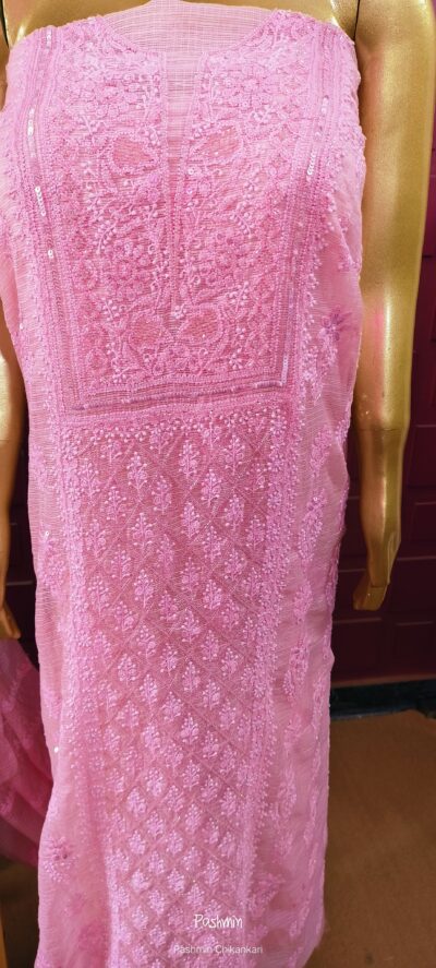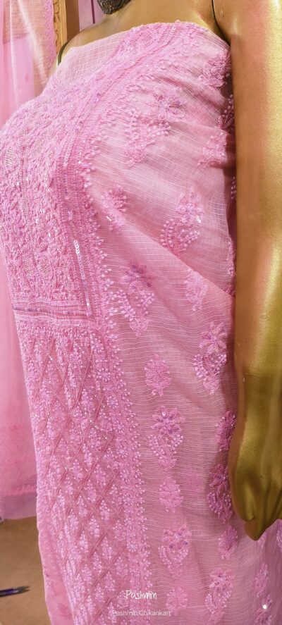 Pink Chikankari Unstitched Kota Kurta And Dupatta With Sequins Katdana And Pearl Work