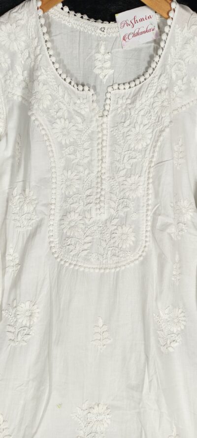 White Chikankari Cotton Neck Lace Work Kurta