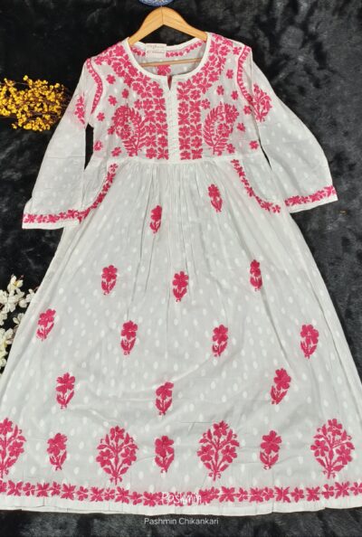 White Chikankari Dobby Cotton Front Pocket Kurta Gown