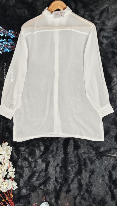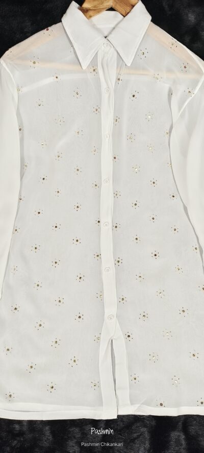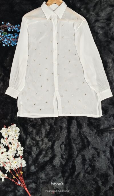 White Chikankari Viscose Shirt With Floral Mukiash Work
