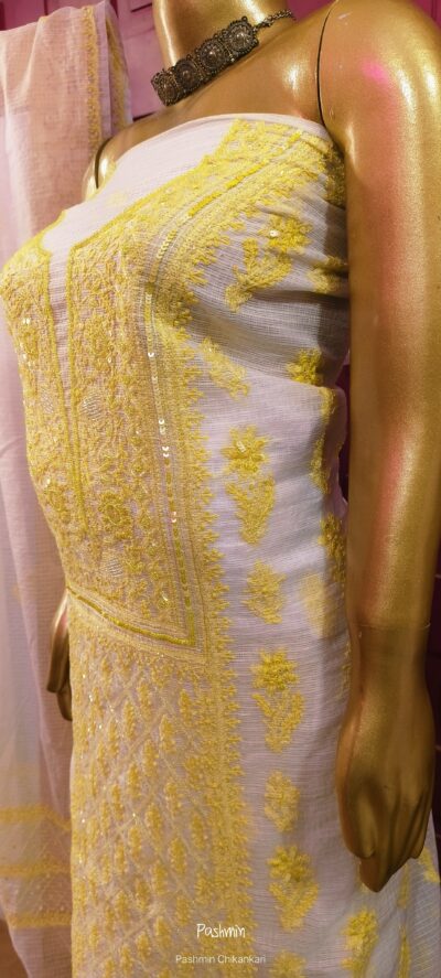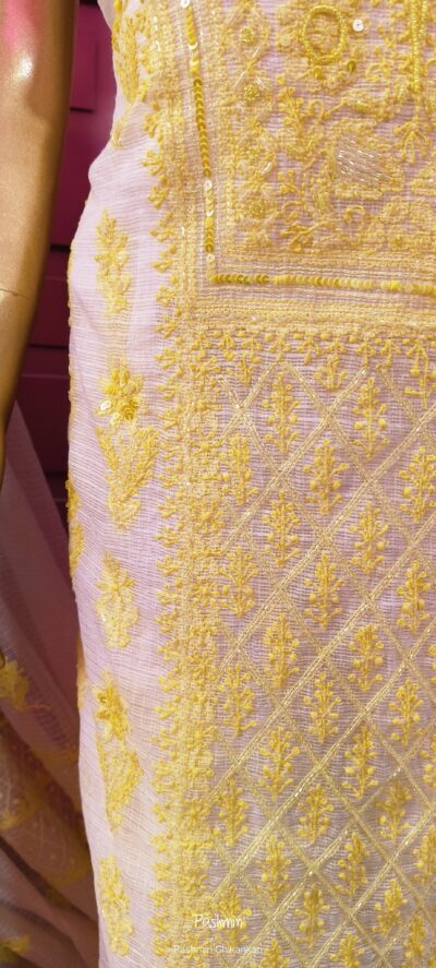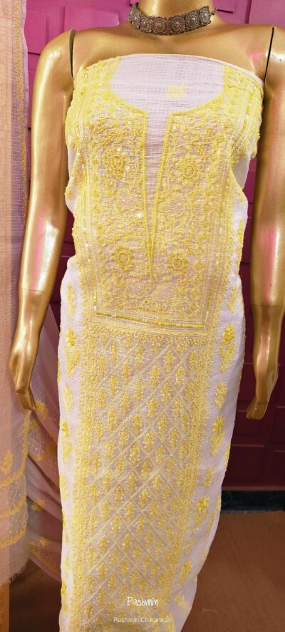 Yellow Chikankari Unstitched Kota Kurta And Dupatta With Sequins Katdana And Pearl Work